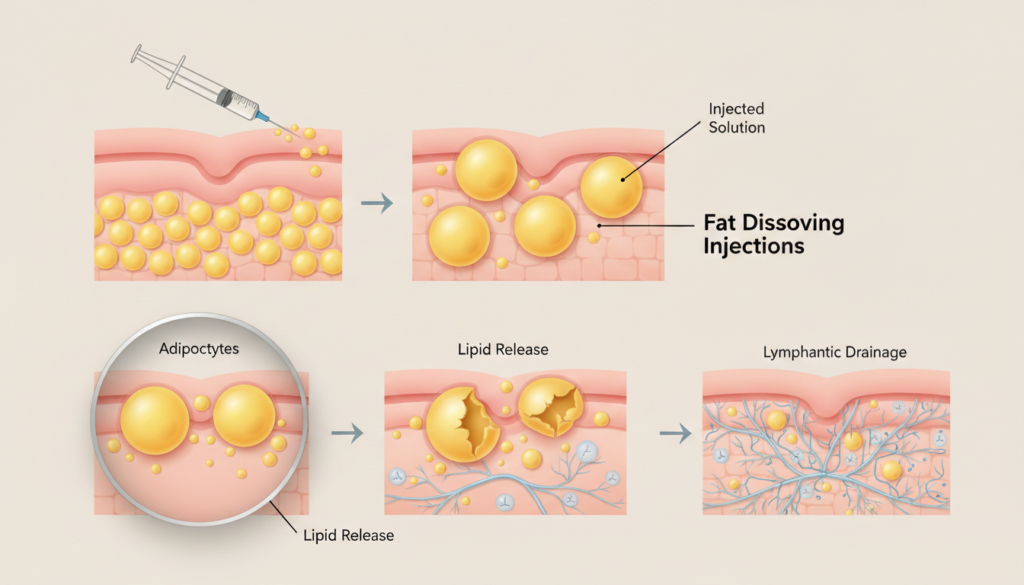 Fat dissolving injections are a non-invasive fat reduction treatment that uses deoxycholic acid-based solutions to break down and permanently destroy fat cells.